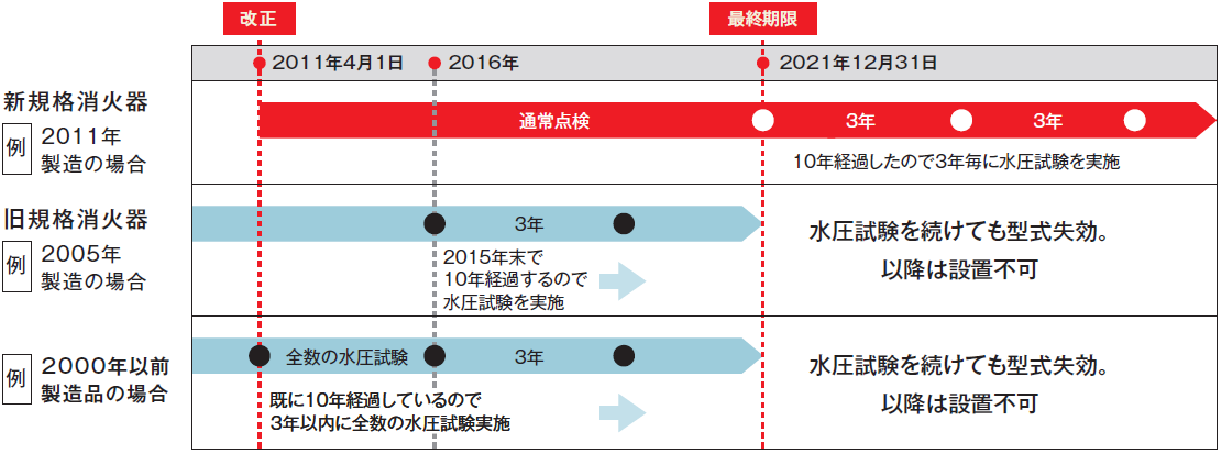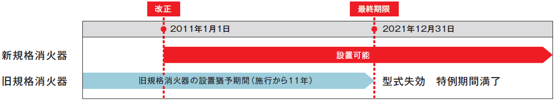 新規格への変更に伴い、旧規格の消火器は型式失効となりました。特例として、型式失効による新規格消火器への移行猶予期間は法改正後11年間、2021年12月31日までとなっています。法令により、消火器設置義務のある防火対象物では、この期間内に新規格消火器に変更する必要があります。