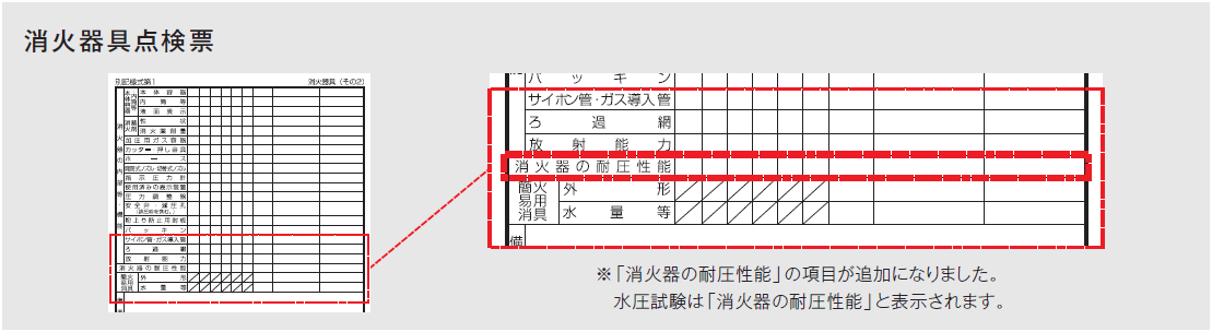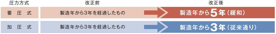 「消火器の内部および機能点検」は、従来、製造年から3年を経過したものに対し実施していましたが、蓄圧式消火器については製造年から5年を経過したものに変更となり、緩和されました。