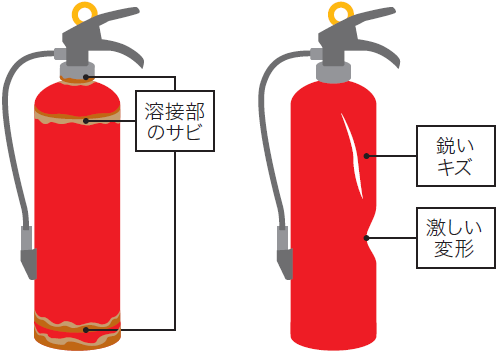 設計標準使用期限内でも、水がかかる場所や湿気の多い場所など、設置場所や状況によっては老朽化する場合があります。消火器は非常に高い圧力で中の消火薬剤を噴出する仕組みです。老朽化した容器は破裂する可能性もあり、大変危険ですので、絶対に使用しないでください。