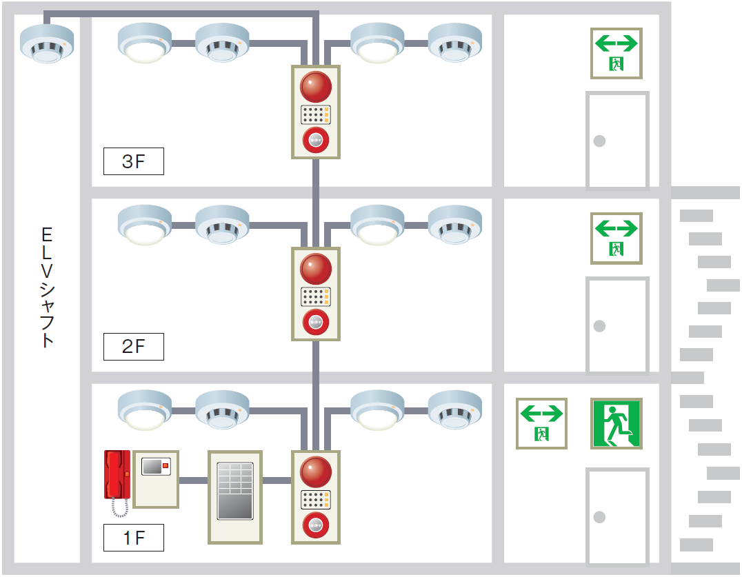 受信機・発信機・表示灯・地区音響装置・感知器から構成されます。